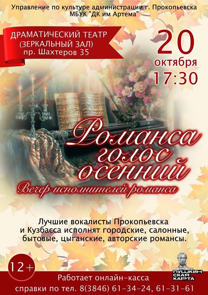 20 октября в 17:30 прокопчан и гостей города в уютном Зеркальном зале Драматического театра ждет вечер романтики, лирики и замечательных эмоций – Гала-концерт открытого городского фестиваля исполнителей романса «Романса голос осенний»!