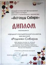В Кузбассе проходит VII Межрегиональный фольклорный фестиваль-конкурс устного и музыкального творчества «Легенды Сибири». Он организован в рамках Международного фестиваля «Народы России и СНГ» и посвящен в этом году 110-летию со дня основания Государственного Российского Дома народного творчества имени В. Д. Поленова. В числе участников фестиваля – народный коллектив хор русской песни «Родники Сибири» (художественный руководитель – Надежда Ганзий) Дворца культуры им. Артема.
