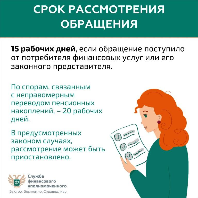 Ваши обращения финансовый уполномоченный рассматривает 15 рабочих дней (по спорам, связанным с неправомерным переводом пенсионных накоплений, – 20 рабочих дней) – без вашего визита. Никуда не нужно ходить.