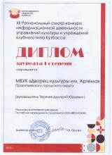 Подведены итого XII региональном смотре-конкурсе информационной деятельности управлений культуры и учреждений клубного типа Кузбасса. В нем принял участие и Дворец культуры им. Артема. В копилке творческой команды ДК – диплом Лауреата I степени!