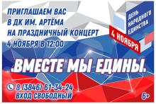 4 ноября в 12.00 в фойе Дворца культуры им. Артема пройдет праздничный концерт «Вместе мы едины», посвященный Дню народного единства.