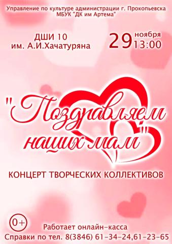 В честь праздника главных людей на свете – мам – творческие коллективы ДК им. Артема подарят зрителям коктейль из позитивных эмоций, творчества и замечательного настроения!